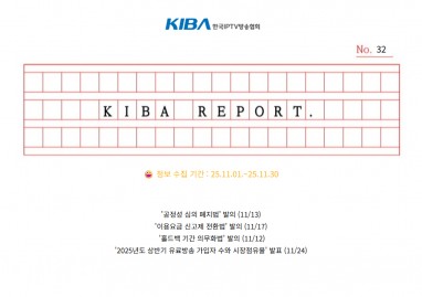 협회안내 인사말 협회소개/연혁 조직안내 회원사소개 회원사 가입안내 오시는길 알림마당 공지사항 보도자료 협회소식 관련소식 미디어안내 IPTV 소개 IPTV관련 주요지표 방송통계자료 자료실 발간자료 영상자료 일반자료 유료방송 가입자 현황 관련 법령 정보 유료방송광고자율심의 공지사항 광고심의신청 심의완료 목록 KIBA REPORT HOME 자료실 KIBA REPORT 카드뉴스 KIBA REPORT DMTL 디지털 미디언스 구독하기 제목내용제목+내용글쓴이 검색 32 <KIBA REPORT> 32호 31 <KIBA REPORT> 31호 30 <KIBA REPORT> 30호 29 <KIBA REPORT> 29호 28 <KIBA REPORT> 28호 27 <KIBA REPORT> 27호 26 <KIBA REPORT> 26호 25 <KIBA REPORT> 25호 24 <KIBA REPORT> 24호 23 <KIBA REPORT> 23호 22 <KIBA REPORT> 22호 21 <KIBA REPORT> 21호 20 <KIBA REPORT> 20호 19 <KIBA REPORT> 19호 18 <KIBA REPORT> 18호 열린1페이지 2페이지 3페이지